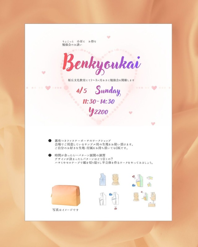勉強会のお知らせ お陰様で10年開講したTREND SEWINGは新しい活動領域に入りました。 レッスンにお越し頂いたお客様、通って頂いていた生徒様 本当にお世話になりまして、ありがとうございました! いつもあった場所がなくなってしまうのは寂しいと ありがたいお声も聞く事が出来、心から感謝しております。 これからは個人コンサルと外部ワークショップやイベント、ポップアップなどを中心に 外交的な動きがメインになります。 しかしTREND SEWINGやWORKSHOPをきっかけに生まれた 洋裁とのご縁が途切れてしまうのは残念です。 そのような事から1〜3ヶ月に1回と ランダムにはなりますが 桜丘文化教室にて、勉強会を開催して参ります。 ぜひご参加頂ければ幸いです。 内容はリクエストをお聞きしたり その時々の楽しそうな事をピックアップします。 ワンポイントレッスンや質疑応答など 疑問点を直接聞けるチャンスもございます。 ミシンを持ち込む時もあるので ご予約のみとさせて頂きます ⋯⋯⋯⋯⋯⋯ 今回は何をするの? ①「裏地つきファスナーポーチ」のワークショップ 趣味でソーイングをやってみたい方 ハンドメイド起業したい方 勉強会で色々なアイテムの作り方を覚えて作家を目指してみたい方、色々な方におすすめです! 表地、裏側生地、ファスナーはこちらでご用意があります。 この生地で作りたい!という生地があったらお持ちください。ファスナーと糸の色は種類がないので ご自分で生地をお持ちになりたい方で 附属も色を合わせたかったらお持ちください。 材料の用尺は後ほどお知らせしますので 改めてこちらのページを覗いてください。 ミシンは一人一台ではなく、周回利用となります。 簡単なお道具の貸し出しがございますが 使い慣れたお道具があれば 必要に応じてお持ちください。 こちらは時間が余ったら… ②洋服のパターンってどうなっているの? デザインを描いたらどのような手順でパターンを引くの? ハサミで紙を切ったり、セロテープで貼ったりして、組み立てる、例題ドリルをやってみよう! パターンに親しむ演習をします!