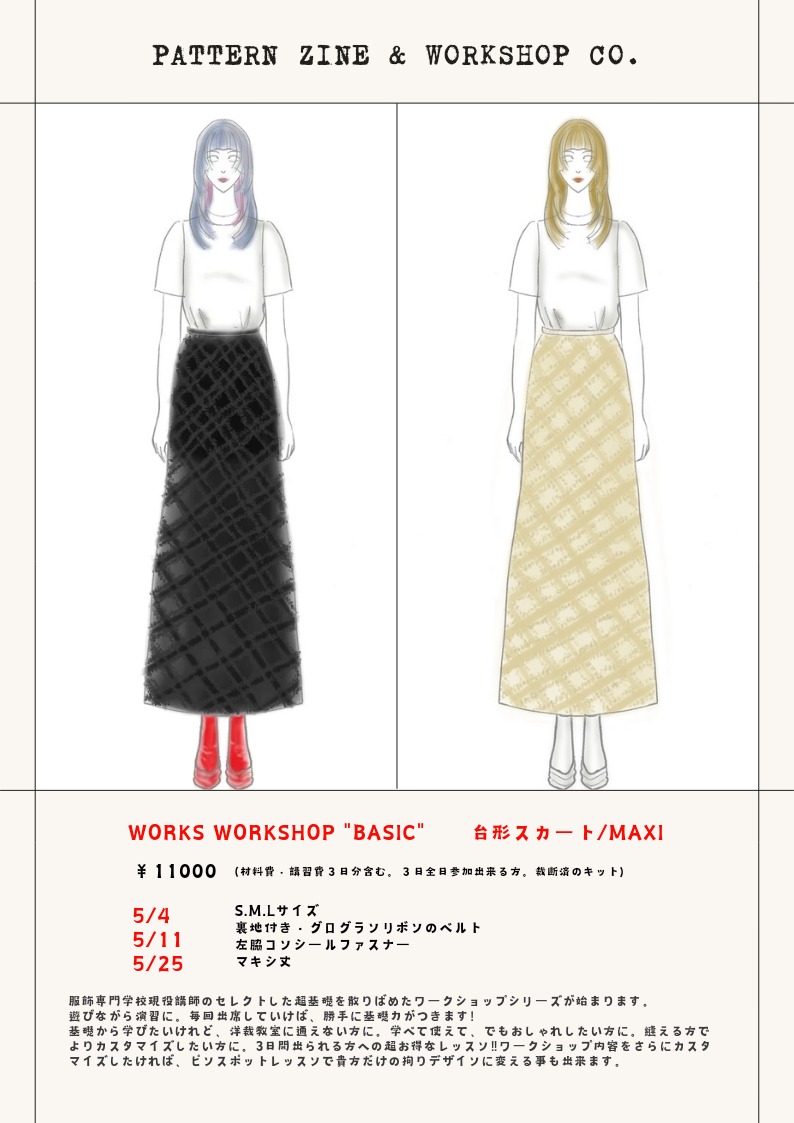 4月27日教室まで来られる方は、シーチングで制作したトワルをご試着も可能です。ご予約の上、お越し下さい